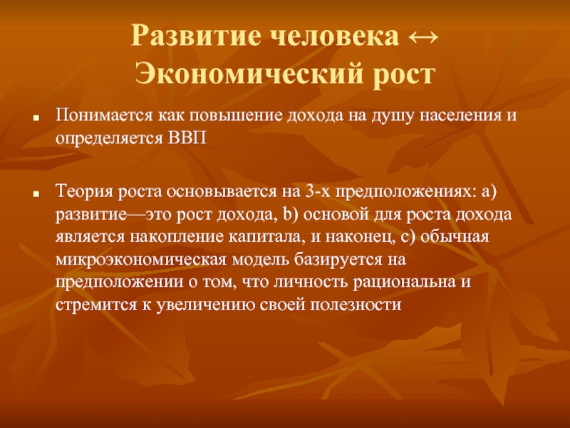 Теория роста основывается на 3-х предположениях: a) развитие—это рост дохода, b) основой для роста дохода является накопление капитала, и наконец, c) обычная микроэкономическая модель базируется на предположении о том, что личность рациональна и стремится к увеличению своей полезности