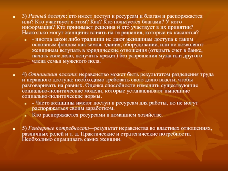 5) Гендерные потребности—результат неравенства во властных отношениях, различных ролей и т. д. Практические и стратегические потребности. Необходимо спрашивать самих женщин.