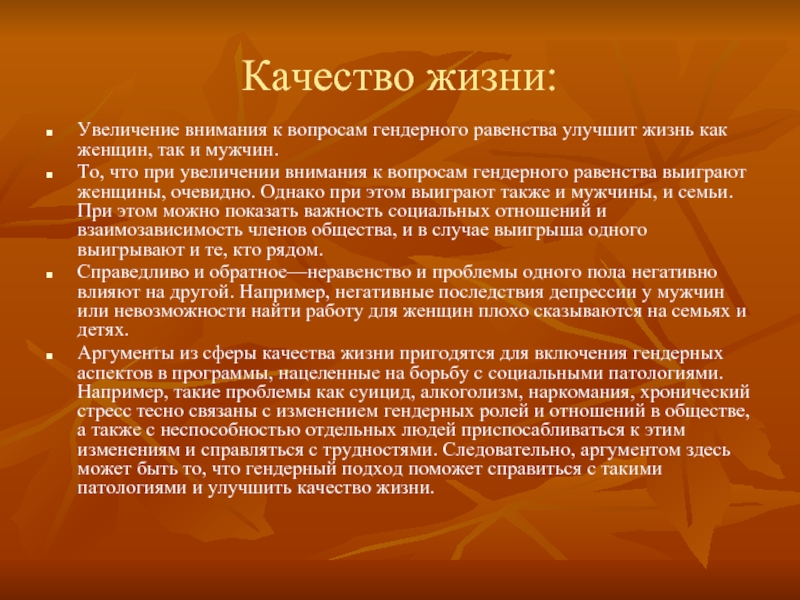 Аргументы из сферы качества жизни пригодятся для включения гендерных аспектов в программы, нацеленные на борьбу с социальными патологиями. Например, такие проблемы как суицид, алкоголизм, наркомания, хронический стресс тесно связаны с изменением гендерных ролей и отношений в обществе, а также с неспособностью отдельных людей приспосабливаться к этим изменениям и справляться с трудностями. Следовательно, аргументом здесь может быть то, что гендерный подход поможет справиться с такими патологиями и улучшить качество жизни.