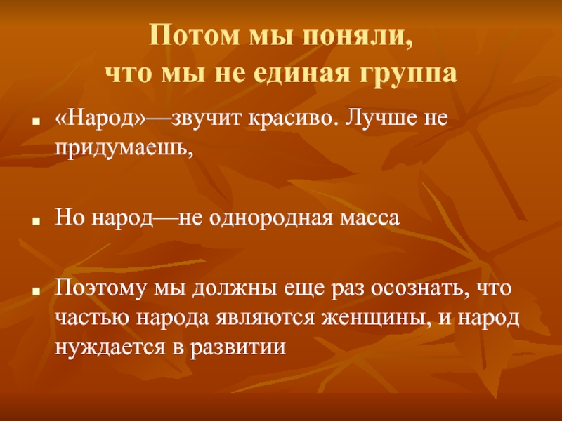 Поэтому мы должны еще раз осознать, что частью народа являются женщины, и народ нуждается в развитии