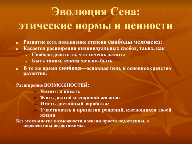 Свобода и полномочия, возможности выбора. Сен: свобода имеет как конститутивную ценность (т. е. ценна сама по себе), так и ценность инструментальную (как инструмент достижения эффективности и равенства)