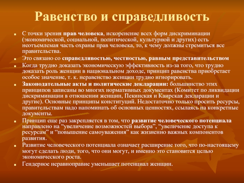 (экономической, социальной, политической, культурной и других) есть неотъемлемая часть охраны прав человека, то, к чему должны стремиться все правительства.