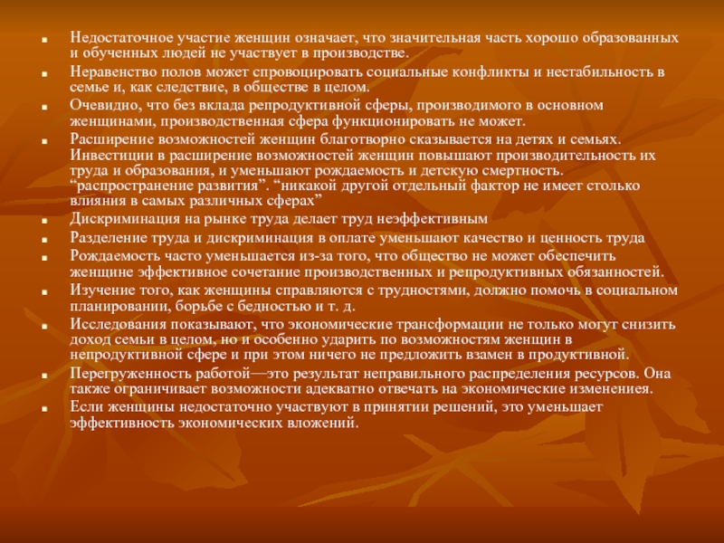 Слайд 36Недостаточное участие женщин означает, что значительная часть хорошо образованных и обученных