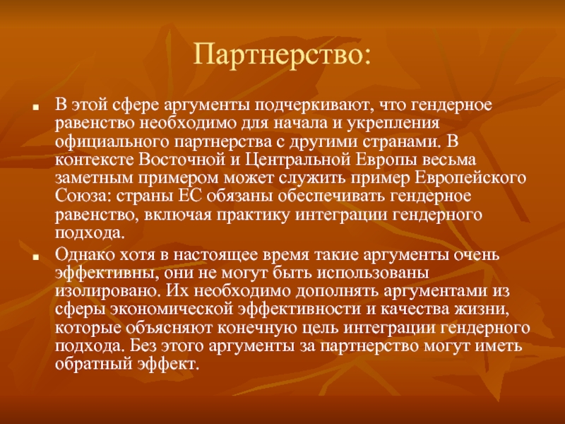 Однако хотя в настоящее время такие аргументы очень эффективны, они не могут быть использованы изолировано. Их необходимо дополнять аргументами из сферы экономической эффективности и качества жизни, которые объясняют конечную цель интеграции гендерного подхода. Без этого аргументы за партнерство могут иметь обратный эффект.