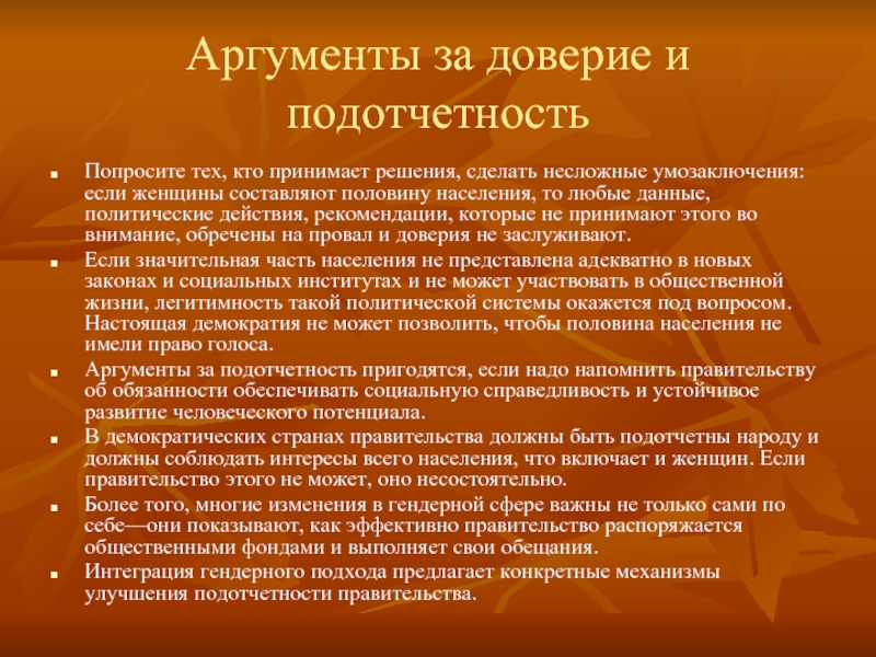 В демократических странах правительства должны быть подотчетны народу и должны соблюдать интересы всего населения, что включает и женщин. Если правительство этого не может, оно несостоятельно.
