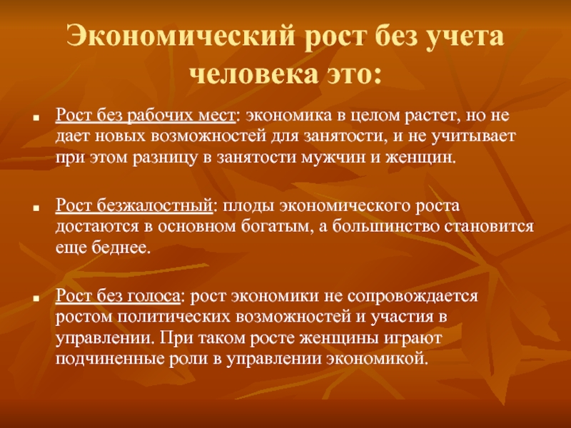 Рост без голоса: рост экономики не сопровождается ростом политических возможностей и участия в управлении. При таком росте женщины играют подчиненные роли в управлении экономикой.