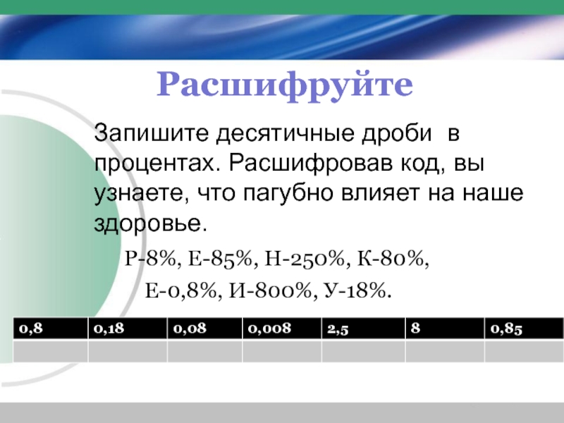 Запишите десятичные дроби в процентах. Расшифровав код, вы узнаете, что пагубно влияет на наше здоровье.