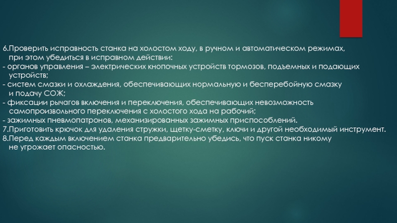 2.Убедиться в хорошем состоянии станка и рабочего места, убрать всё, что может вызвать падение.