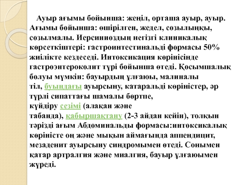 Ағымы бойынша: өшірілген, жедел, созылыңқы, созылмалы. Иерсиниоздың негізгі клиникалық көрсеткіштері: гастроинтестинальді формасы 50% жиілікте кездеседі. Интоксикация көрінісінде гастроэнтероколит түрі бойынша өтеді. Қосымшалық болуы мүмкін: бауырдың ұлғаюы, малиналы тіл, буындағы ауырсыну, катаральді көріністер, әр түрлі сипаттағы шамалы бөртпе, күйдіру сезімі (алақан және табанда), қабыршақтану (2-3 айдан кейін), толқын тәрізді ағым Абдоминальды формасы:интоксикалық көріністе оң және мықын аймағында аппендицит, мезаденит ауырсыну синдромымен өтеді. Сонымен қатар артралгия және миалгия, бауыр ұлғаюымен жүреді.
