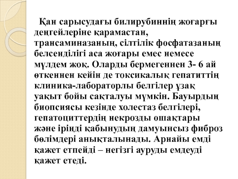 Слайд 16   Қан сарысудағы билирубиннің жоғарғы деңгейлеріне қарамастан, трансаминазаның, сілтілік