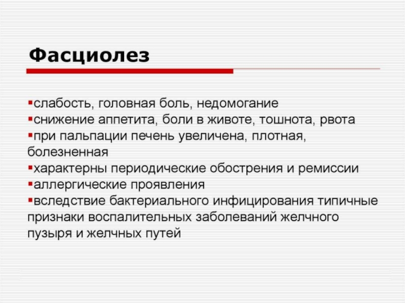 характеризующаяся преимущественным поражением гепатобилиарной системы. Течение фасциолеза сопровождается недомоганием, лихорадкой, крапивницей, тошнотой, болями в правом подреберье, увеличением размеров печени, желтухой.