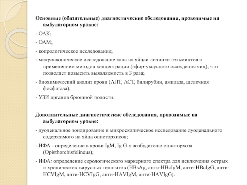 Слайд 21Основные (обязательные) диагностические обследования, проводимые на амбулаторном уровне: