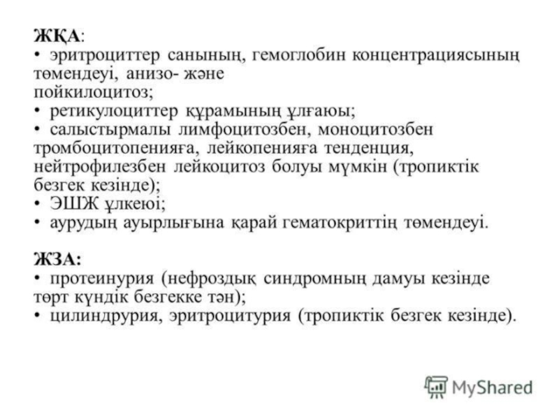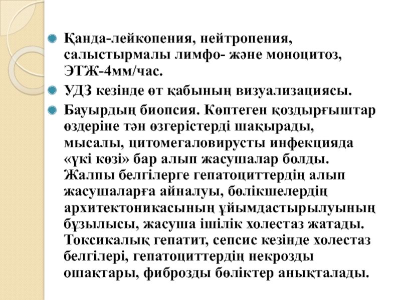Слайд 18Қанда-лейкопения, нейтропения, салыстырмалы лимфо- және моноцитоз, ЭТЖ-4мм/час.