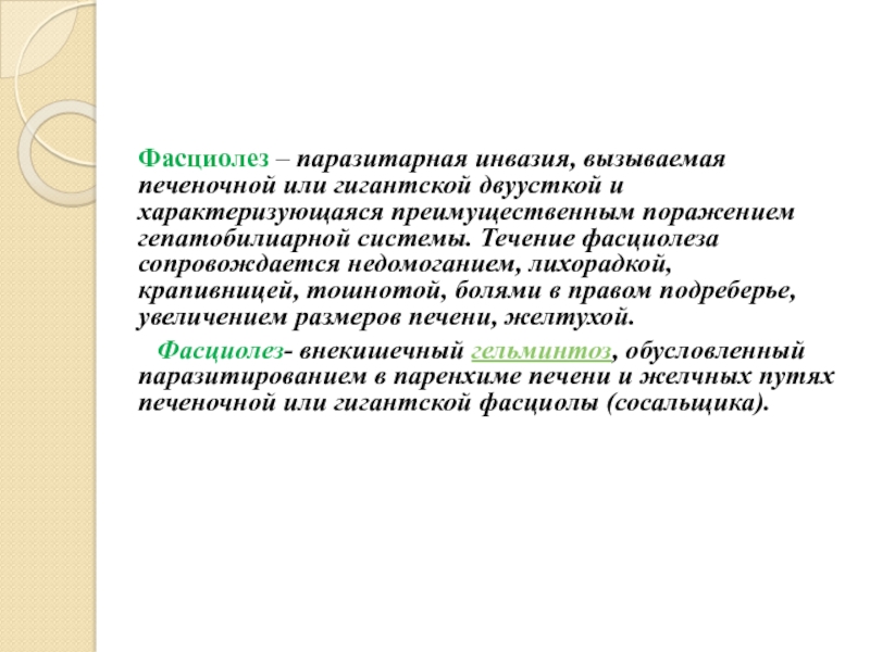 Слайд 26  Фасциолез – паразитарная инвазия, вызываемая печеночной или гигантской двуусткой и