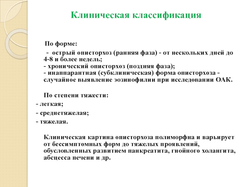 Клиническая картина описторхоза полиморфна и варьирует от бессимптомных форм до тяжелых проявлений, обусловленных развитием панкреатита, гнойного холангита, абсцесса печени и др.