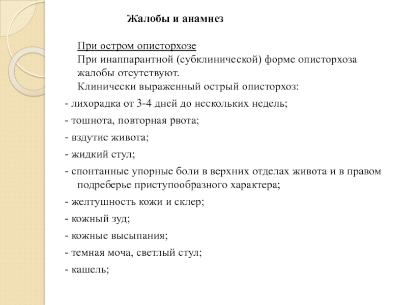 При инаппарантной (субклинической) форме описторхоза жалобы отсутствуют.