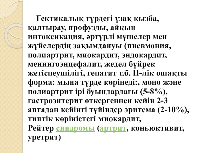 ауру. Клиникалық көрінісі полиморфизмді: асқазан-ішек жолдарын, буындарды зақымдаумен, сондай-ақ интоксикация, қызба өршуі және рецидивімен сипатталады.