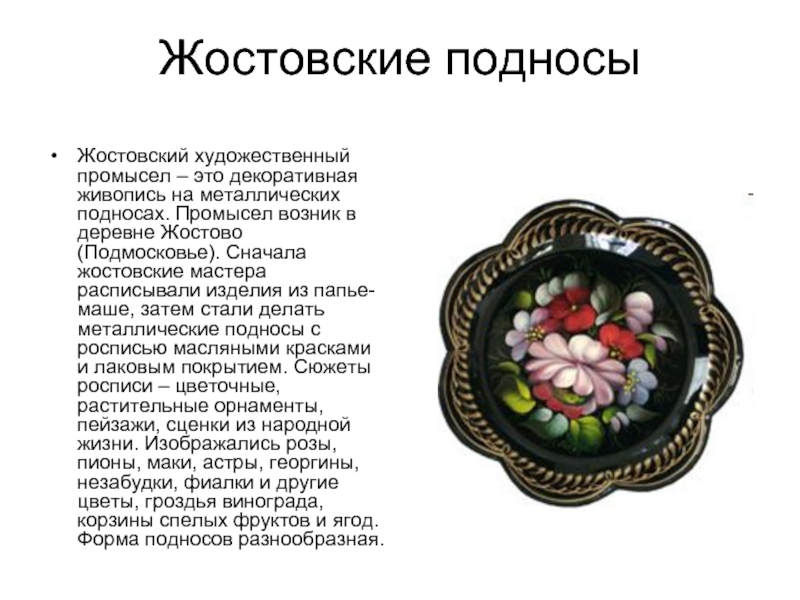 Промысел возник в деревне Жостово (Подмосковье). Сначала жостовские мастера расписывали изделия из папье-маше, затем стали делать металлические подносы с росписью масляными красками и лаковым покрытием. Сюжеты росписи – цветочные, растительные орнаменты, пейзажи, сценки из народной жизни. Изображались розы, пионы, маки, астры, георгины, незабудки, фиалки и другие цветы, гроздья винограда, корзины спелых фруктов и ягод. Форма подносов разнообразная.