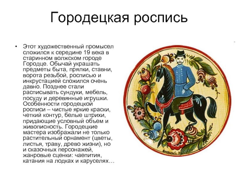 волжском городе Городце. Обычай украшать предметы быта, прялки, ставни, ворота резьбой, росписью и инкрустацией сложился очень давно. Позднее стали расписывать сундуки, мебель, посуду и деревянные игрушки. Особенности городецкой росписи – чистые яркие краски, четкий контур, белые штрихи, придающие условный объем и живописность. Городецкие мастера изображали не только растительный орнамент (цветы, листья, траву, древо жизни), но и сказочных персонажей, жанровые сценки: чаепития, катания на лодках и каруселях…