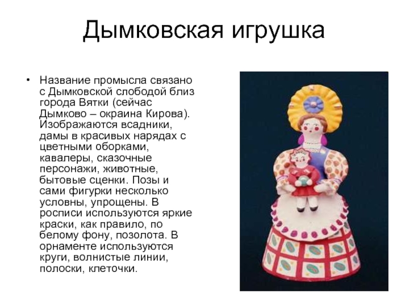 Дымково – окраина Кирова). Изображаются всадники, дамы в красивых нарядах с цветными оборками, кавалеры, сказочные персонажи, животные, бытовые сценки. Позы и сами фигурки несколько условны, упрощены. В росписи используются яркие краски, как правило, по белому фону, позолота. В орнаменте используются круги, волнистые линии, полоски, клеточки.