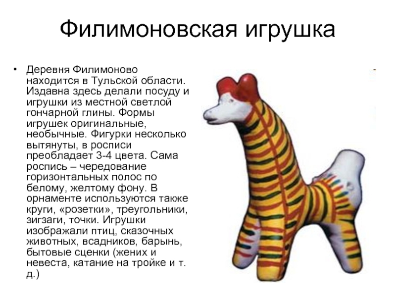 и игрушки из местной светлой гончарной глины. Формы игрушек оригинальные, необычные. Фигурки несколько вытянуты, в росписи преобладает 3-4 цвета. Сама роспись – чередование горизонтальных полос по белому, желтому фону. В орнаменте используются также круги, «розетки», треугольники, зигзаги, точки. Игрушки изображали птиц, сказочных животных, всадников, барынь, бытовые сценки (жених и невеста, катание на тройке и т.д.)