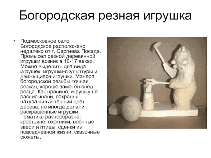 Промысел резной деревянной игрушки возник в 16-17 веках. Можно выделить два вида игрушек: игрушки-скульптуры и движущиеся игрушки. Манера богородской резьбы точная, резкая, хорошо заметен след резца. Как правило, игрушку не расписывали, сохраняя натуральный теплый цвет дерева, но иногда делали раскрашенные игрушки. Тематика разнообразна: крестьяне, охотники, военные, звери и птицы, сценки из повседневной жизни, сказочные сюжеты.