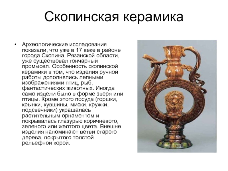города Скопина, Рязанской области, уже существовал гончарный промысел. Особенность скопинской керамики в том, что изделия ручной работы дополнялись лепными изображениями птиц, рыб, фантастических животных. Иногда само издели было в форме зверя или птицы. Кроме этого посуда (горшки, крынки, кувшины, миски, кружки, подсвечники) украшалась растительным орнаментом и покрывалась глазурью коричневого, зеленого или желтого цвета. Внешне изделия напоминают ветви старого дерева, покрытого толстой рельефной корой.