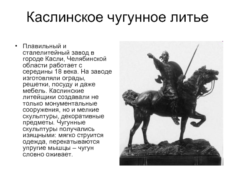 работает с середины 18 века. На заводе изготовляли ограды, решетки, посуду и даже мебель. Каслинские литейщики создавали не только монументальные сооружения, но и мелкие скульптуры, декоративные предметы. Чугунные скульптуры получались изящными: мягко струится одежда, перекатываются упругие мышцы – чугун словно оживает.