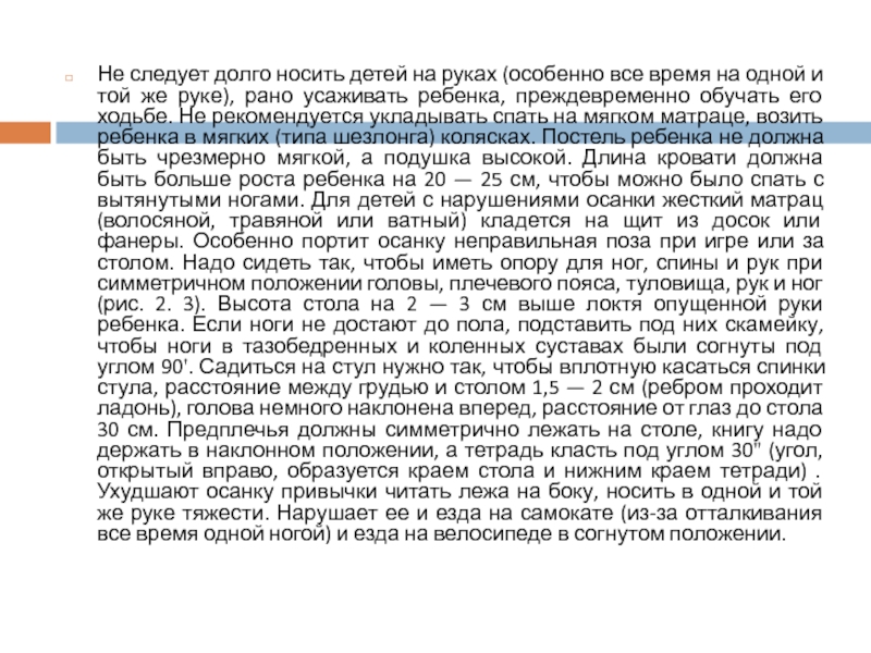 одной и той же руке), рано усаживать ребенка, преждевременно обучать его ходьбе. Не рекомендуется укладывать спать на мягком матраце, возить ребенка в мягких (типа шезлонга) колясках. Постель ребенка не должна быть чрезмерно мягкой, а подушка высокой. Длина кровати должна быть больше роста ребенка на 20 — 25 см, чтобы можно было спать с вытянутыми ногами. Для детей с нарушениями осанки жесткий матрац (волосяной, травяной или ватный) кладется на щит из досок или фанеры. Особенно портит осанку неправильная поза при игре или за столом. Надо сидеть так, чтобы иметь опору для ног, спины и рук при симметричном положении головы, плечевого пояса, туловища, рук и ног (рис. 2. 3). Высота стола на 2 — 3 см выше локтя опущенной руки ребенка. Если ноги не достают до пола, подставить под них скамейку, чтобы ноги в тазобедренных и коленных суставах были согнуты под углом 90'. Садиться на стул нужно так, чтобы вплотную касаться спинки стула, расстояние между грудью и столом 1,5 — 2 см (ребром проходит ладонь), голова немного наклонена вперед, расстояние от глаз до стола 30 см. Предплечья должны симметрично лежать на столе, книгу надо держать в наклонном положении, а тетрадь класть под углом 30" (угол, открытый вправо, образуется краем стола и нижним краем тетради) .