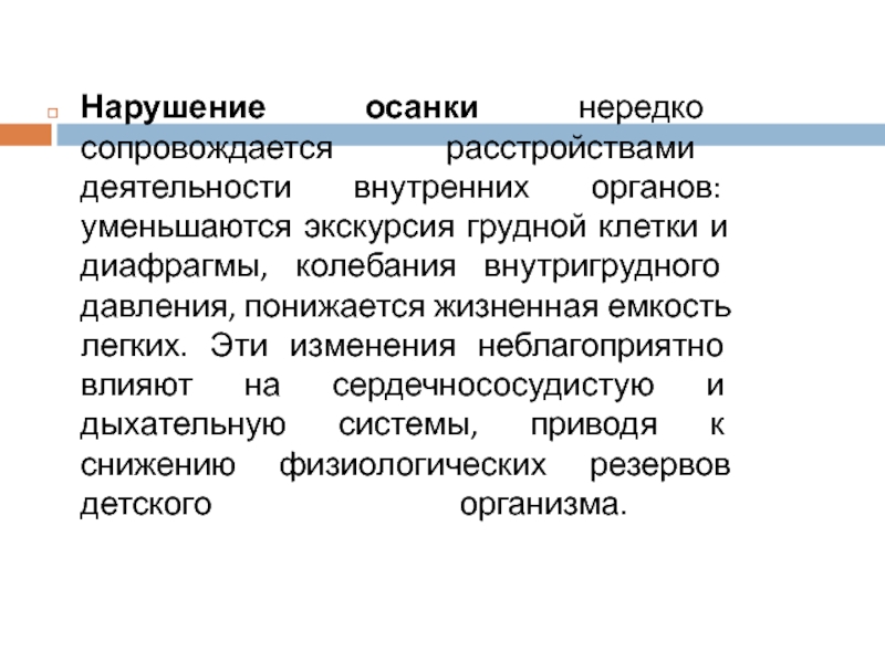 Слайд 4Нарушение осанки нередко сопровождается расстройствами деятельности внутренних органов: уменьшаются экскурсия грудной
