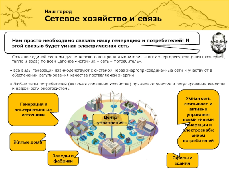 Умная сеть связывает и активно управляет всеми типами генерации и электроснабжением потребителей