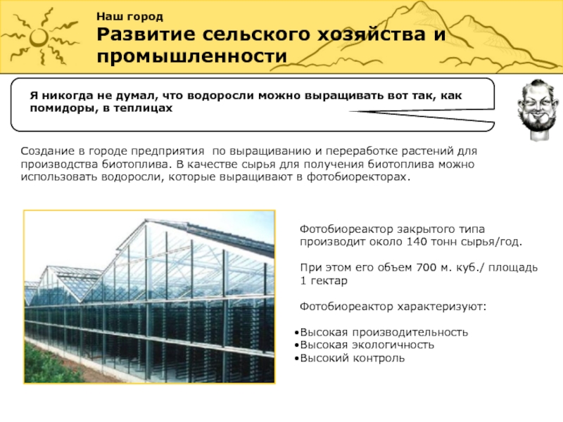 Создание в городе предприятия по выращиванию и переработке растений для производства биотоплива. В качестве сырья для получения биотоплива можно использовать водоросли, которые выращивают в фотобиоректорах.