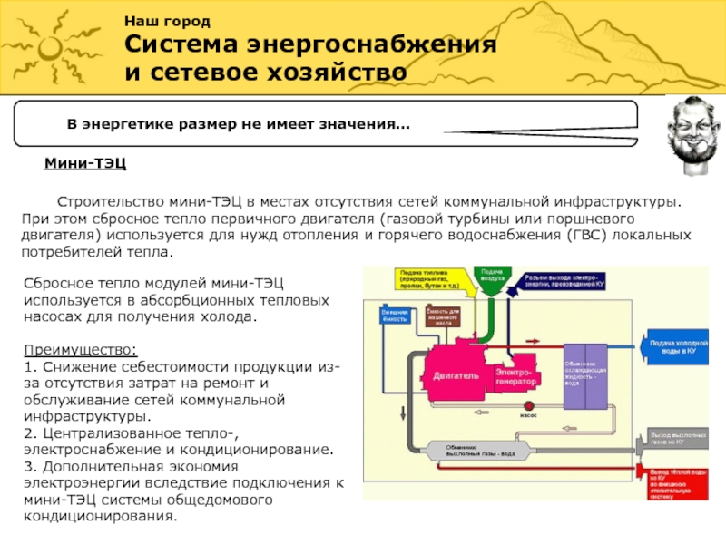 Строительство мини-ТЭЦ в местах отсутствия сетей коммунальной инфраструктуры. При этом сбросное тепло первичного двигателя (газовой турбины или поршневого двигателя) используется для нужд отопления и горячего водоснабжения (ГВС) локальных потребителей тепла.