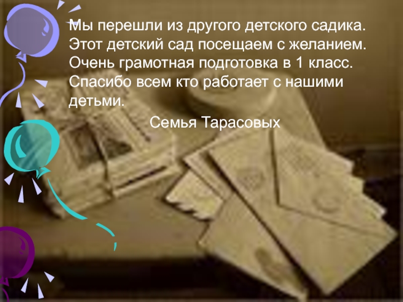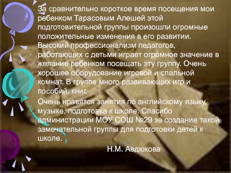 Слайд 31За сравнительно короткое время посещения мои ребенком Тарасовым Алешей этой подготовительной