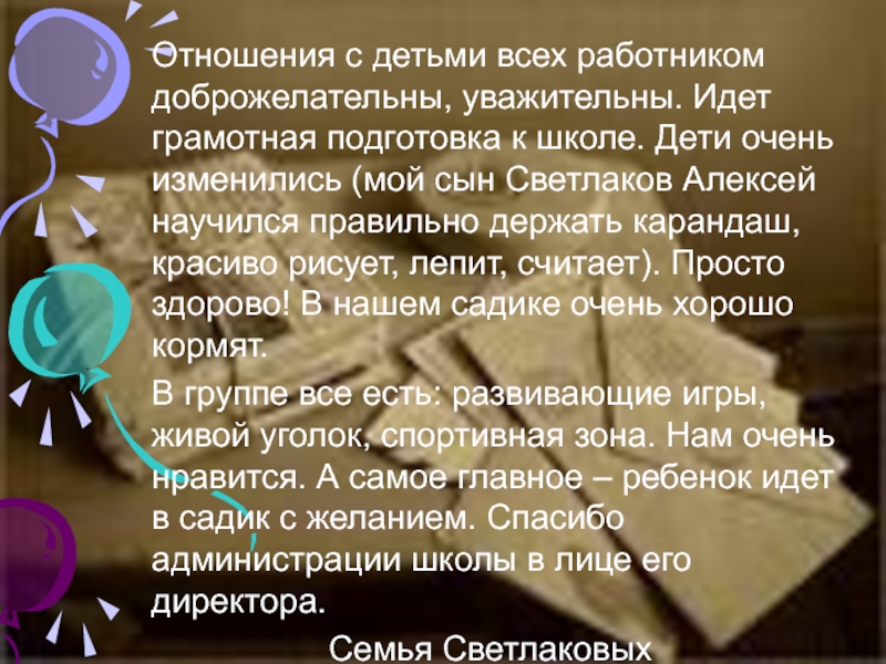школе. Дети очень изменились (мой сын Светлаков Алексей научился правильно держать карандаш, красиво рисует, лепит, считает). Просто здорово! В нашем садике очень хорошо кормят.