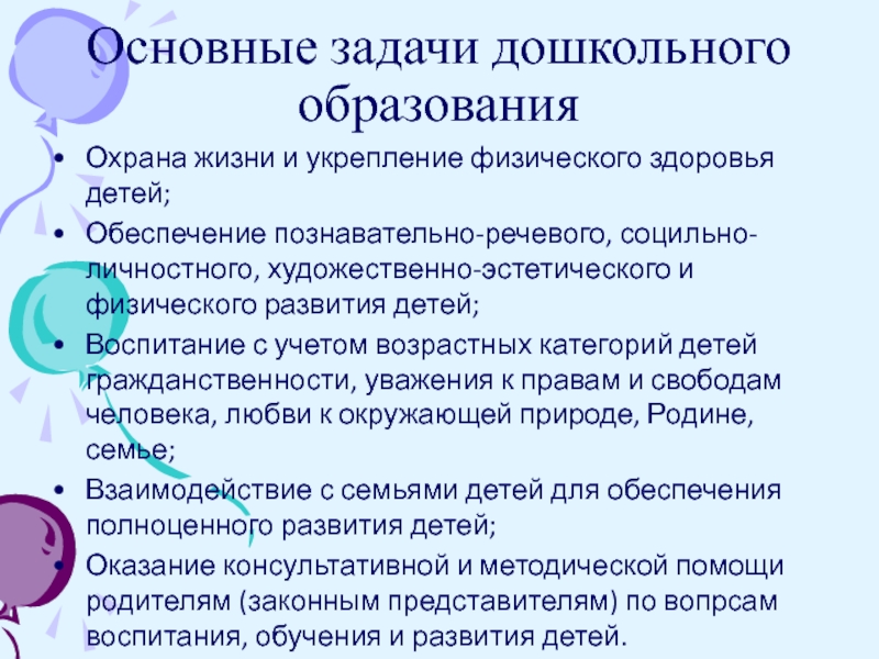 Оказание консультативной и методической помощи родителям (законным представителям) по вопрсам воспитания, обучения и развития детей.