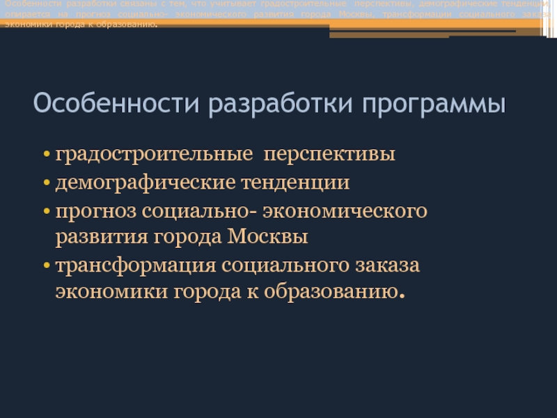 Особенности разработки связаны с тем, что учитывает градостроительные перспективы, демографические тенденции, опирается на прогноз социально- экономического развития города Москвы, трансформации социального заказа экономики города к образованию.