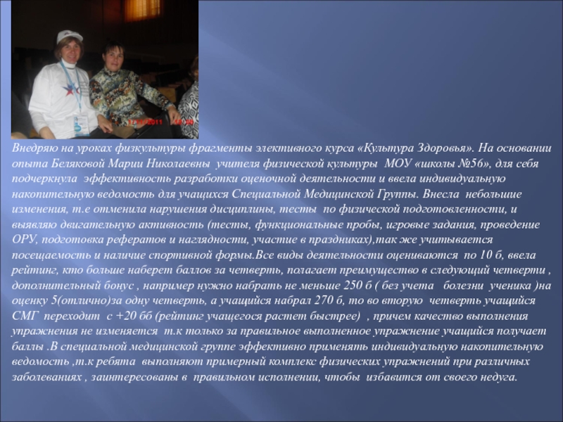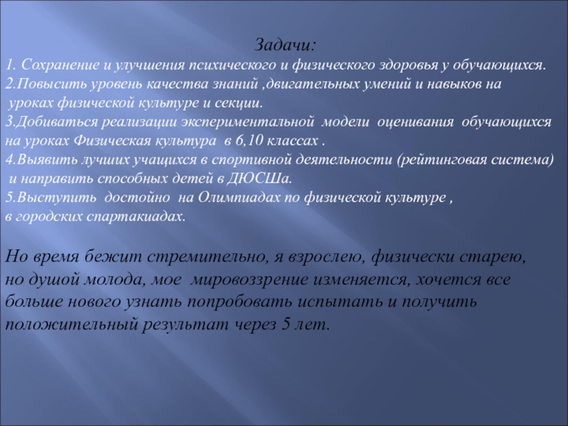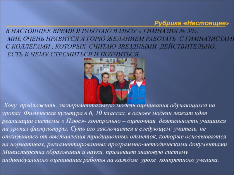Хочу предложить экспериментальную модель оценивания обучающихся на уроках Физическая культура в 6, 10 классах, в основе модели лежит идея реализации системы « Плюс»- контрольно – оценочная деятельность учащихся на уроках физкультуры. Суть его заключается в следующем: учитель, не отказываясь от выставления традиционных отметок, которые основываются на нормативах, регламентированных программно-методическими документами Министерства образования и науки, применяет знаковую систему индивидуального оценивания работы на каждом уроке конкретного ученика.