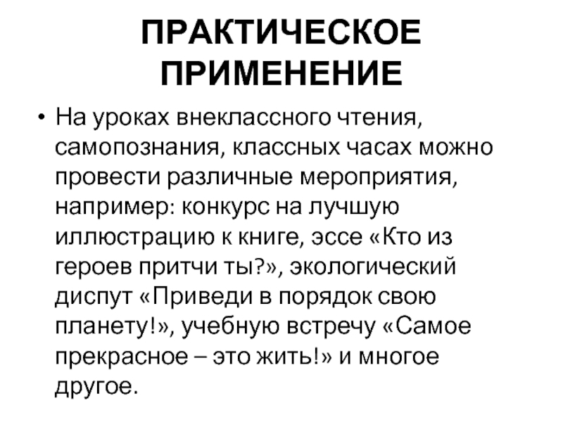 мероприятия, например: конкурс на лучшую иллюстрацию к книге, эссе «Кто из героев притчи ты?», экологический диспут «Приведи в порядок свою планету!», учебную встречу «Самое прекрасное – это жить!» и многое другое.