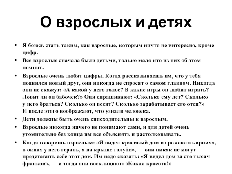 Когда говоришь взрослым: «Я видел красивый дом из розового кирпича, в окнах у него герань, а на крыше голуби», — они никак не могут представить себе этот дом. Им надо сказать: «Я видел дом за сто тысяч франков», — и тогда они восклицают: «Какая красота!»