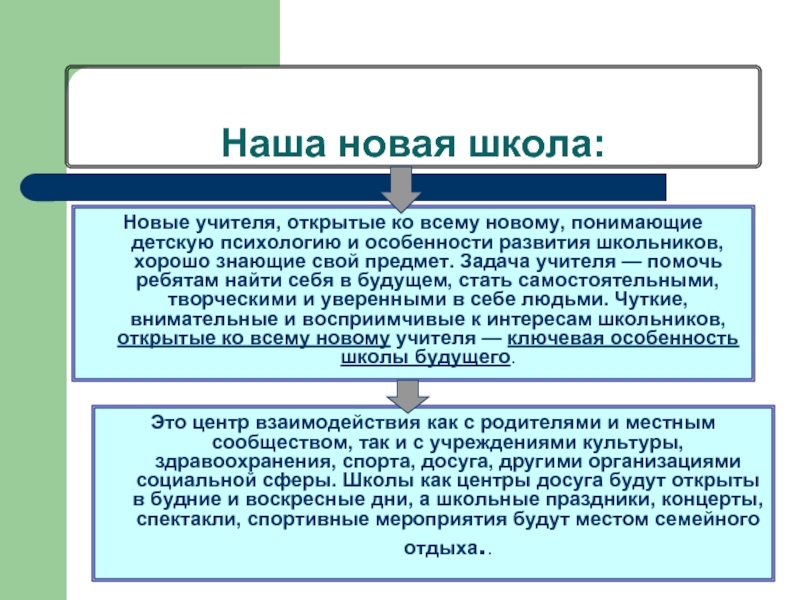 Это центр взаимодействия как с родителями и местным сообществом, так и с учреждениями культуры, здравоохранения, спорта, досуга, другими организациями социальной сферы. Школы как центры досуга будут открыты в будние и воскресные дни, а школьные праздники, концерты, спектакли, спортивные мероприятия будут местом семейного отдыха..