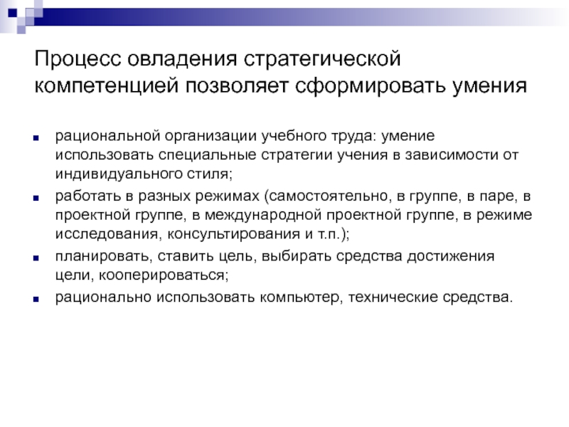 Слайд 16Процесс овладения стратегической компетенцией позволяет сформировать умения