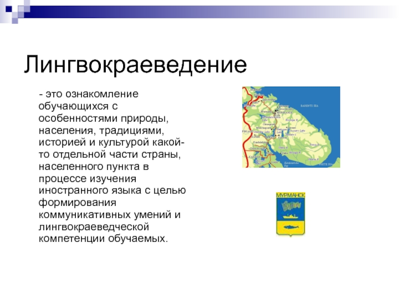населения, традициями, историей и культурой какой-то отдельной части страны, населенного пункта в процессе изучения иностранного языка с целью формирования коммуникативных умений и лингвокраеведческой компетенции обучаемых.