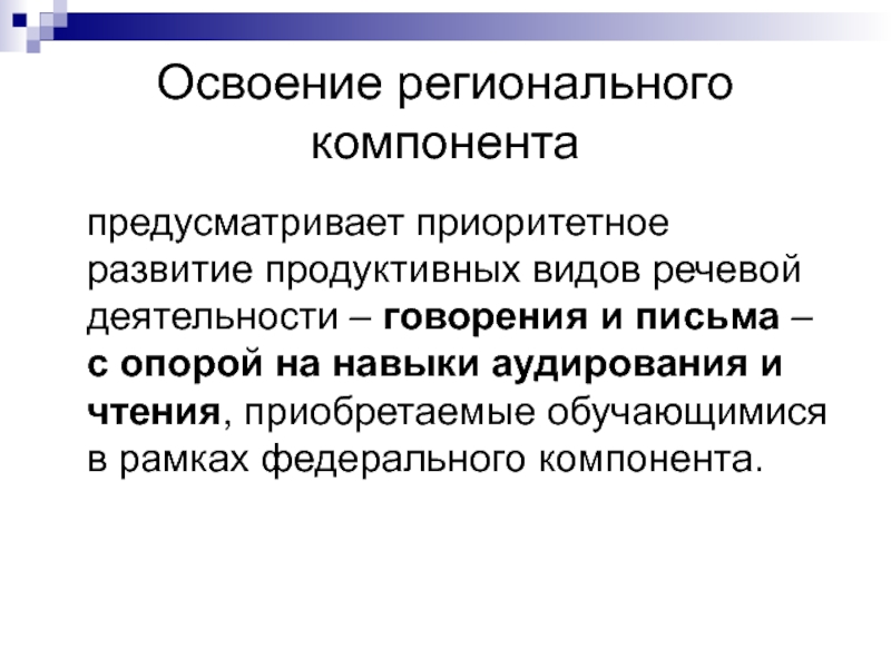 деятельности – говорения и письма – с опорой на навыки аудирования и чтения, приобретаемые обучающимися в рамках федерального компонента.