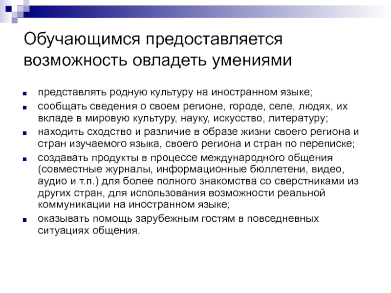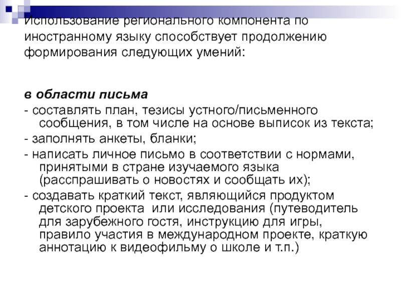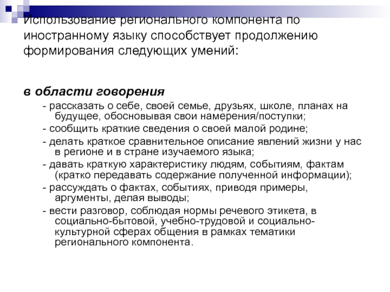 Слайд 22Использование регионального компонента по иностранному языку способствует продолжению формирования следующих умений: