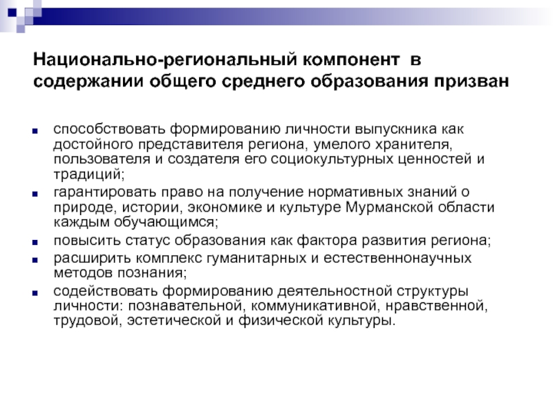 Слайд 5Национально-региональный компонент в содержании общего среднего образования призван