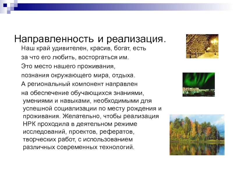 на обеспечение обучающихся знаниями, умениями и навыками, необходимыми для успешной социализации по месту рождения и проживания. Желательно, чтобы реализация НРК проходила в деятельном режиме исследований, проектов, рефератов, творческих работ, с использованием различных современных технологий.