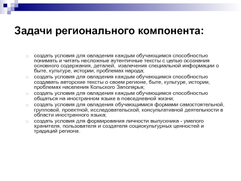 создать условия для овладения каждым обучающимся способностью создавать авторские тексты о своем регионе, быте, культуре, истории, проблемах населения Кольского Заполярья;