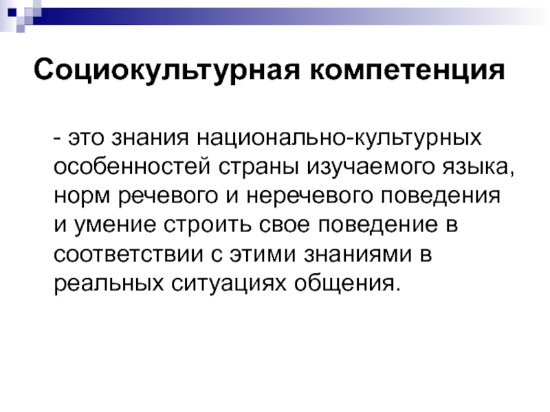 норм речевого и неречевого поведения и умение строить свое поведение в соответствии с этими знаниями в реальных ситуациях общения.