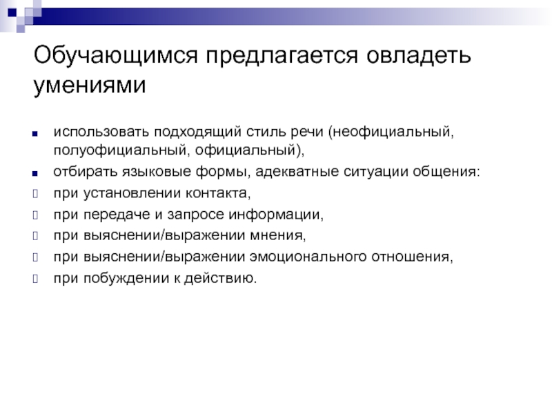 использовать подходящий стиль речи (неофициальный, полуофициальный, официальный),
